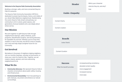 The challenge for this project was to design a website for the Gwynns Falls Community that felt both fun and functional. The site needed to serve a small but dedicated group of neighbors by making it easy to share updates, highlight upcoming events, showcase community photos, and provide a welcoming space for donors to learn more and support local initiatives.
